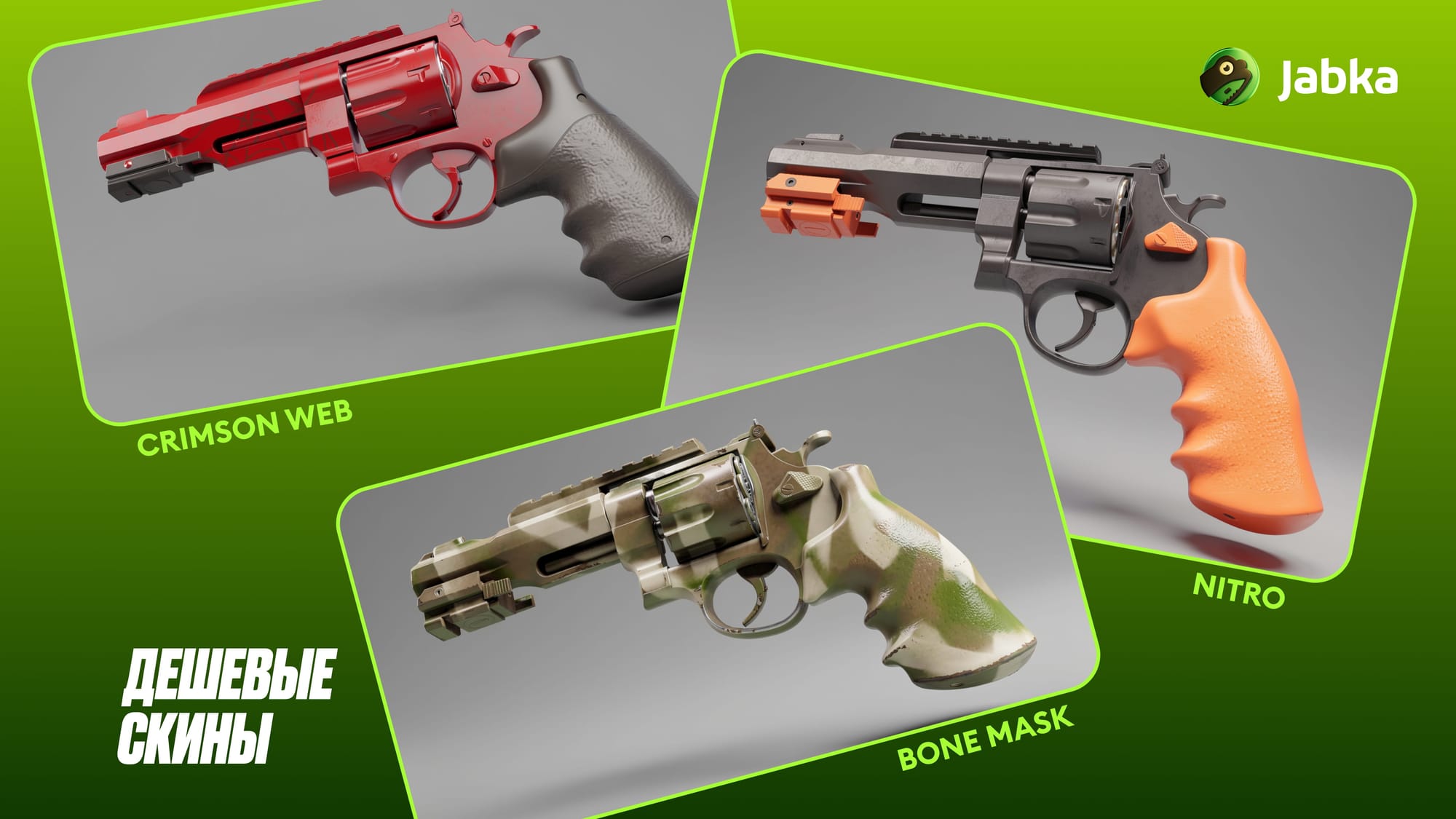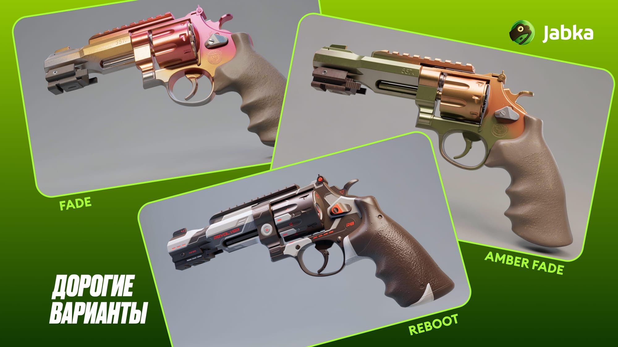 Получить скины на R8 Revolver можно несколькими способами: купить на торговой площадке Steam или на сторонних маркетах. И самый выгодный вариант – открыть кейсы КС 2 на Jabka.